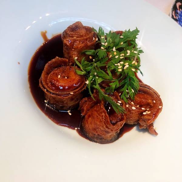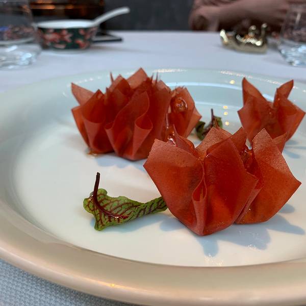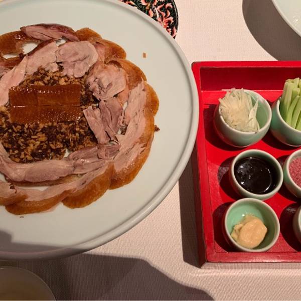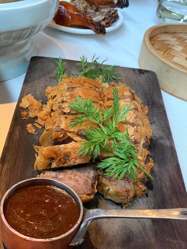 【酥皮牛小排】虽然是新品,新颖但不失美味!香酥外壳加上软嫩的多汁的牛肉,简直享受。【山楂鹅肝】用山楂的酸甜遮挡鹅肝的肥腻,恰到好处。【山药酪】一上桌就仙气四溢,全桌人立马举起手机,录视频拍照忙碌的紧。一直到干冰的雾气消失才想起品尝甜品。茉莉花和山药的组合=绵密的花香口感,也很推荐【酥皮虾】的个头很大,咬一口一本满足【茉莉花烤鸭】一鸭多吃,皮粘糖直接吃,肉沾酱卷饼,鸭松放在娃娃菜盏上一起入口。我最爱的还是皮粘糖,虽然充满了包裹着脂肪的负罪感…【糖油饼】可能之前的甜品都太惊艳,外加吃了太多的糖分,这道糖油饼感觉中规中矩,和其他好吃的菜肴有点不搭【豌豆跳跳蛙】最后意犹未尽,我们又加点了一道蛙,努力维持的仙女人设在这道重口味美食前荡然无存