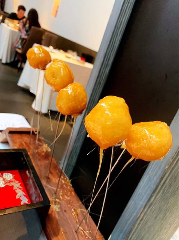 【拔丝榴莲】任别人再怎么夸,我本人也不是很喜欢吃榴莲(干吃,以及各种做法的榴莲都不喜欢)。同去的一个闺蜜反而是榴莲的老缠粉,十分坚持点了这道拔丝榴莲。上菜后发现造型很别致,是动态的(可惜没法上传视频)。闺蜜觉得很好吃,我尝了一口,仍旧不喜。
