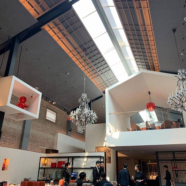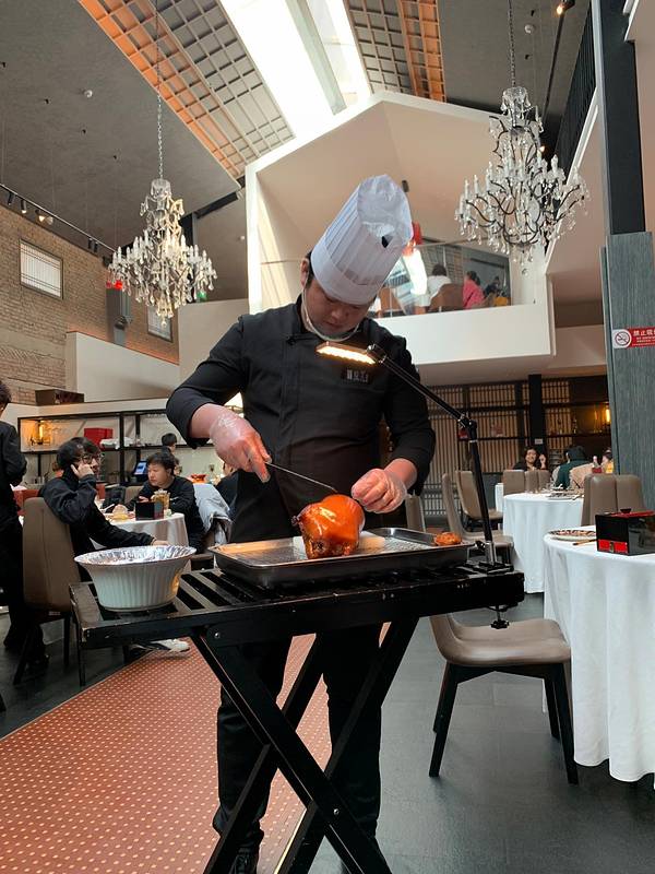店内环境:一排低调的铁色大门,依旧抵挡不住飘来的香气,灰墙红砖,食客满堂。现代化的装修风格中包含的中国传统文化,半开放式的烤鸭房一进门就看得到。店内摆设的艺术品被赋予了工业风气,但也为丢失中式感。
