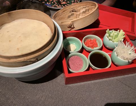 - 一鸭多吃,皮粘糖,肉沾酱卷饼,鸭松放在娃娃菜上金骆驼