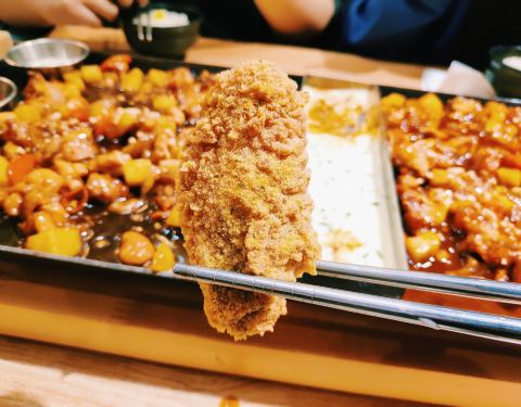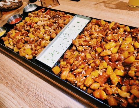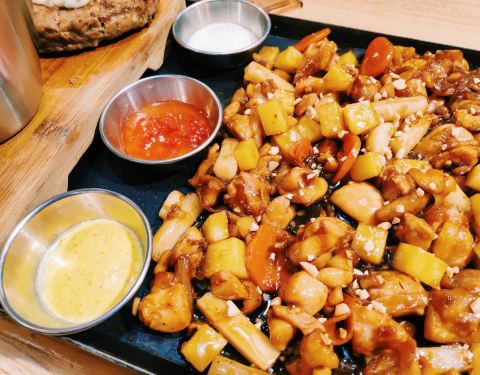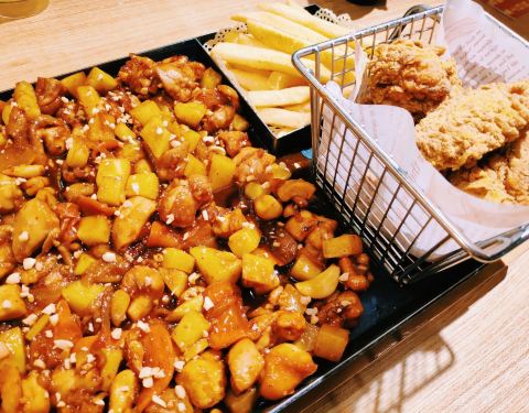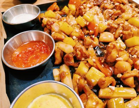 菜品选择了2-3人餐7.5DM套餐,原味和甜辣分米鸡。 味道还好,主要是鸡肉蘸芝士这个玩法挺有创意