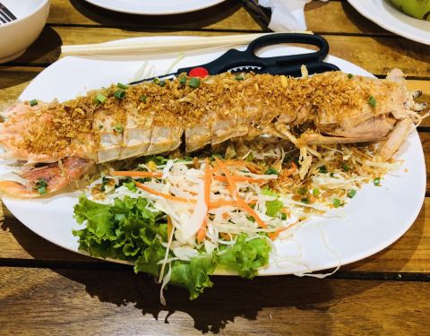 这是泰国芭提雅当地一家比较有特色的海鲜餐厅,店面很大很敞亮,大多以开放式的空间为主,门口放着大大小小的容器,里面各种海鲜应有尽有,皮皮虾、龙虾、蟹是主打,我们点了最受欢迎的蒜茸龙虾、椒盐皮皮虾、咖喱蟹、冬阴功汤、蒜泥空心菜、还有一些小吃和烧烤,性价比很高,份量足,口感也不错,满意,老板还送了我们芒果糯米饭,很好吃