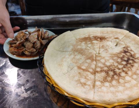 火爆花甲,花甲是蒜香味的,很好吃很入味,秘制大饼,好大ー盘,吃起非常很香