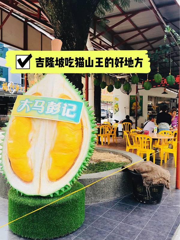 🔰推荐理由: 价格公道,品质好,正宗猫山王 之前看过不少香港人,广东人推荐过, 这家店铺算是有缘看到,路上🚖经过好几次, 就在阿罗街附近,不能错过的吃榴莲的好地方。 🔰时间: 9:00-22:00 🚗地址:27-b jalan imbi,medan imbi, 55100 KualaLumpur ▪️▪️▪️▪️▪️ 🔰环境: 一个有棚顶的大排档摊位,地方挺大, 可以带走,也可以直接在店里吃。 有榴莲还有周边的冰淇淋 和其它水果,以榴莲为主。 ▪️▪️▪️▪️▪️ 🔰亮点特色: ❶如果是猫山王的季节,🍦冰淇淋可以现做, 把榴莲肉打到冰淇淋机器里去加工, 等十分钟左右,奶香浓郁、入口即化, 满口清香扑鼻很过瘾。 ❷就算不是猫山王的季节, 他们也还是会有材料做成冰淇淋🍦的。 ▪️▪️▪️▪️▪️▪️ ❸猫山王榴莲出名,出肉率高, 核不大,口感棒,奶香浓郁, ✅推荐你们可以试试XO或苏丹, 红虾等其他品种的榴莲, 大马的榴莲还是很棒的, 其他地方吃不到的味道,带点苦味, 黑刺更是香港人认定的稀有高端品种, 其实也就是老红虾,我个人更喜欢XO。 ❹老板娘很热情,是个嫁去大马几十年的东北人, 性格很豪爽,很可爱,送了榴莲冰淇淋🍦吃, 聊天聊得很开心🥳。 ▪️▪️▪️▪️▪️ 💰人均消费: 一般两个人吃个小的也够了, 很喜欢吃的一个人吃一个也可以, 猫山王一般50——60马币一公斤 🔹🔹🔹🔹🔹 总的来说,以后有机会再来吉隆坡 一定会去品尝彭记猫山王榴莲。