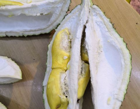 去年11月去马来西亚,某日去马六甲观光,从马六甲返回时,有同行的伙伴执着于猫山王榴莲,所以我们的本地向导就带我们来了这家彭记水果档,据说很有名。 水果档里有各种时令水果,榴莲也很多。现在好像不是最合适的季节,猫山王不是很多,果肉的品质也不是最佳。当然榴莲果肉的品质也与价格相关,价格高的内部会相对饱满,价格低的内部会空一些。因为猫山王的价格很高,听我们的向导说,本地人也不是想吃就吃的。向导还教我们识别猫山王榴莲的方法,榴莲底部有一个星状的纹路非常明显。我个人对榴莲没有太多的偏好,所以没有品出什么特别来,觉得还没有店里卖的小菠萝味道好,这么贵的价格,实在是有点可惜了!