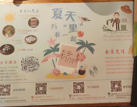 【超适合约会的一家音乐餐厅】 一直想去胡桃里音乐餐厅,便赶在周末挑了附近的一家分店,网上订好了套餐,便迫不及待前往,晚上6点左右就抵达了目的地。这家店地理位置还不错,就在真北路地铁口,步行五分钟即可到达,外观非常有特色,整个店面被绿植环绕着,走进店里,像是走进了一片森林🏡。 买了一份套餐,套餐里面含有一份胡桃里招牌烤鸡,一份炝炒油麦菜,还有一份香菇酿肉,一份果盘,两份米饭,一盒纸巾。 😋菜品点评: 1⃣|胡桃里烤鸡^:这家店的招牌菜,好像还得了什么奖,一份大概半只鸡的样子,有六七块,肉质超嫩,搭配着泰式的甜辣酱,超级美味,必点的一道菜。 2⃣|炝炒油麦菜^:虽然不爱吃蒜,但这道菜里面有蒜却感觉格外的好吃,菜味刚刚好,入口还能感觉到油麦菜的爽脆与香甜。 3⃣|香菇酿肉^:其实就是把猪肉放到香菇上,做成的一道菜,这道菜感觉一般,有些腻,不是特别推荐。 4⃣|红唇 鸡尾酒^:这个是当天参加餐厅活动中的二等奖,造型好看,味道也不错!杯口附近黏的白砂糖,搭配着鸡尾酒,喝起来有别样的口感。 ⏰营业时间:上午11点到凌晨2点。 其中: 11:00-14:00是午餐时间。 14:00-17:00是下午茶时间。 17:00-21:00是晚餐时间。 21:00-02:00+1是晚市时间。 💛tips: 1.商家每隔一段时间会举办一次全民参与活动,中奖的就可以获得面膜,鸡尾酒,果盘等。我们当时六点多去的,每半个小时会有表演或抽奖,活动还是非常精彩的,当天店里的小伙伴们还集体表演了野狼disco,哈哈,是一个非常适合约会聚会的地方。 2⃣一到晚上九点,普通灯光关闭,舞台灯光开启,乐队登台,每人发一个荧光棒,仿佛身在演唱会现场,气氛非常棒!比心乐队主唱加索,😍唱的不错~所以晚上来最好,一定要待到9点后!