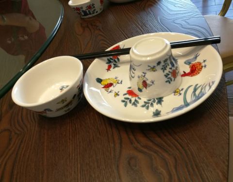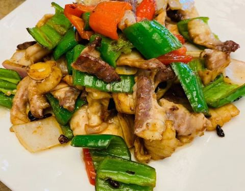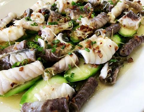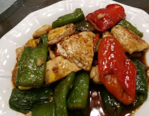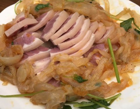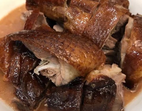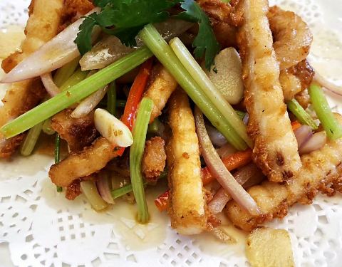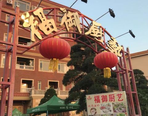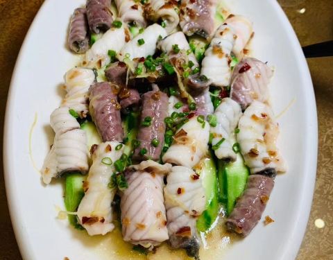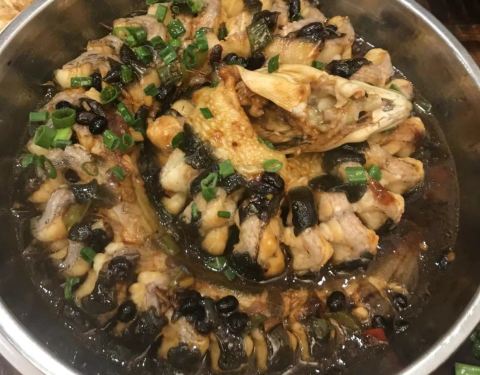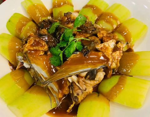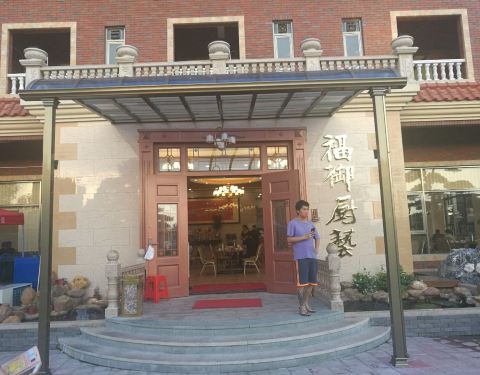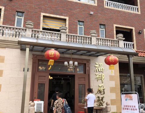 福御厨艺位于芳村东漖大桥坑口南围村28号首层内(芳村南围大排档旁),晚上和家人过来吃饭小聚。这家餐厅离地铁坑口站稍微有点远,出站要步行一二十分钟。搭乘公交站可以在芳村花园总站下车,走进去大约十分钟。餐厅是一栋当地居民的小洋楼改造而成的,一个很大的院子,里面有很多的盆景,还有假山、金鱼池和喷泉。楼房的一层是大厅,二三楼是房间。大厅有大吊灯、瓷砖地面,桌子之间摆的很密,比较嘈杂。出品是以粤菜为主,价格在40-60元的居多。【莲藕章鱼煲猪睁】68元 用个大瓦煲上来,里面的汤料很多,有大块的猪睁肉、莲藕、赤小豆、章鱼、花生等,煲得时间较长,够火候。分量不少,目测大约有十几碗汤。【豆酱鱿鱼须啫豆角】35元 豆角啫得较软,鱿鱼须不多,豆酱放得较多,吃到下面的豆角有些咸。【笨猪手拼海蜇】50元 猪手是凉拌的,切成片,味道有点像粉蹄。海蜇爽口,有点辣。【荔枝木烧鹅皇】58元 分量还可以,烧鹅皮脆肉滑,吃起来有肉汁,不过味道有点咸。【豉汁蒸白鳝】98元/斤 要了一条,有1.9斤。白鳝切成段盘龙状,用豉汁蒸。蒸得很嫩,不过味道很咸。【钵仔豉油皇大肠】42元 大肠肥厚,腌得入味,炸得很香脆。【五柳炸鸡蛋】28元 比较一般,五柳汁放的少,吃起来不够酸甜可口。【蚬肉生菜包】32元 顺德菜中的家常菜, 蚬肉、韭菜、花生、腊肉等,切丁炒了以后,用生菜包着吃。【现藤椒煮鲈鱼】58元 鲈鱼肉切片,很嫩很滑,没有骨头,酸度和辣度适中【豉油皇炒面】20元 炒的很香很干爽。茶位费是3元/位,买单601元,人均消费75元。总的来说福御厨艺环境还可以,出品的味道不错,有个别菜品味道偏咸,分量一般,价格不算很贵。