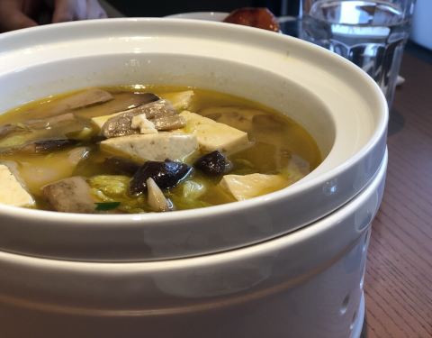 雙人套餐有辣的和不辣的可以選擇,雖說是雙人套餐,但是量蠻多的,兩人不一定能吃完提前好久預約的,好不容易約到週六晚上的…環境還不錯!晚餐5點開始,選修了辣的那一款套餐糖醋藕夾,酸酸甜甜也很脆…味道不錯!松茸湯,是每人一個小茶壺,茶壺看著不大,湯還是喝了好多的感覺茶蓋太燙了,最後喝完湯才打開吃裡面食材,除了松茸還有蟲草花…夫妻素片…有點微辣…好幾種菌菇,口感各不相同…冷菜還有一個拼盤,乾冰效果很漂亮…素的生煎包也不錯!炝豆腐,豆腐是老豆腐,很扎實的感覺,切開吃,會更加入味…很不錯的一次素食體檢