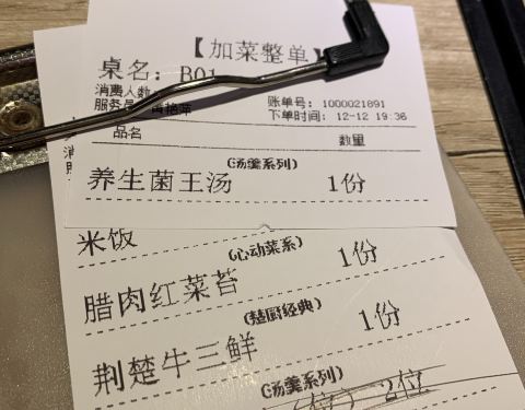 楚厨,湖北菜。JFC品尚中心A馆3楼的尽头,干净整洁,看到评价还不错,于是便来一试。 「荆楚牛三鲜」这个名字立马吸引了牛肉爱好者的我。牛三鲜是牛肉、牛筋、牛肚还有牛皮脂肪的这一层,牛肉挺嫩,牛筋半Q弹半软嫩,牛肚脆嫩,微辣入味,汤汁也非常下饭,超级推荐! 「腊肉红菜苔」有点类似菜心的感觉,口感甜脆,腊肉味道适中,单吃也不会咸!好棒! 因为我最爱的武汉演员朱一龙才知道菜薹,之前在湖南也有吃过,但只是隐隐约约的印象。还问了下服务员菜薹是什么植物,服务员妹妹还查了下跟我分享,很可爱。菜薹就是一种蔬菜。 「养生菌王汤」莲藕排骨没有了退而求其次点的汤,味道不错。汤头很鲜,是里面香菇、海鲜菇、竹荪、虫草花等各种菌类的鲜,菌类爱好者表示很爱! 整体来说,菜品、服务、环境都很不错~