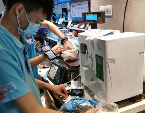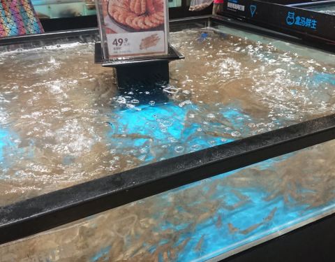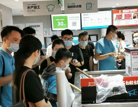 这家盒马鲜生的是广州市的第一家盒马鲜生,开业有一段时间了,当时刚开业的时候非常非常火爆,特别是周末的中午,如果你要等加工海鲜几乎等一个小时是非常的常态。