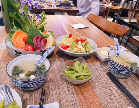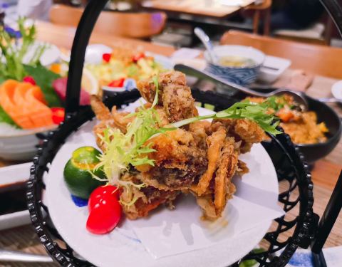 位于鹤洞路中海花湾壹号的路边商铺,以日料为主,据说刚开业不久,店内环境明亮,玻璃展柜摆满了各种日式酒,但靠墙两侧的座位稍窄。出品方面,黄金蕨饼这个小甜品口感不错,冰冰的,弹弹的,没有像麻薯那样黏口;牛油果三文鱼沙拉食材较为新鲜,份量不多,但用料足,里面除了有一半沙拉的蔬菜,还加了腰果和提子干,提升了不少口感;炸软壳蟹,油份处理得不错,不会很油,味道适中,口感像炸的鱿鱼须,不用吐壳又能尝到蟹肉的鲜味,加点青柠汁口感会更佳;鳗鱼炒饭,很有锅气,香气很有食欲,但鳗鱼肉少了点;刺身拼盘,厚薄适中,三文鱼是新鲜的,但鱼脂不够香浓,金枪鱼和带子不错;XO酱菌菇菲力牛,这菜主角是菌菇,牛肉就几块,而且也吃不出XO酱的味道;牛肉奶油烧,被名字骗了,其实就是啫牛肉粒,肉感不错,但数量也就只有六颗,哪怕是M9澳洲牛肉,锅底其余就是洋葱、甜椒和白果等;海鲜炒乌冬,被木鱼的香味覆盖,选用的乌冬不太合适炒,太湿而且口感不好,然后配上两三只虾,两个白贝,总体出品水准波动有点大,部分菜式味道偏淡,性价比一般,亮点是服务态度不错,较多的服务细节能做到位。