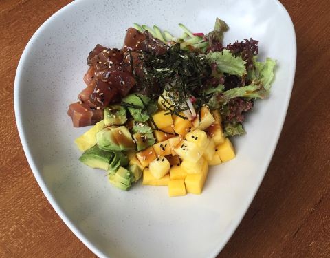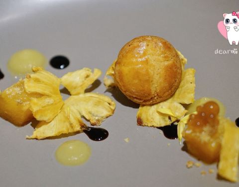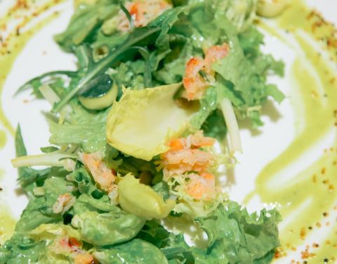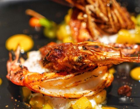 ...生红虾,红虾大多是生吃,没想到这样煮也别有番风味,加入了油桃、牛油果等酱汁的搭配,口感非常丰富