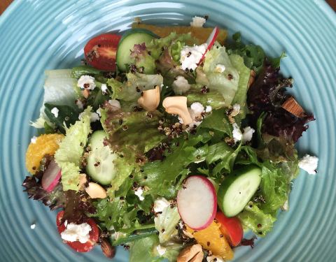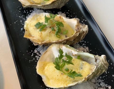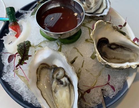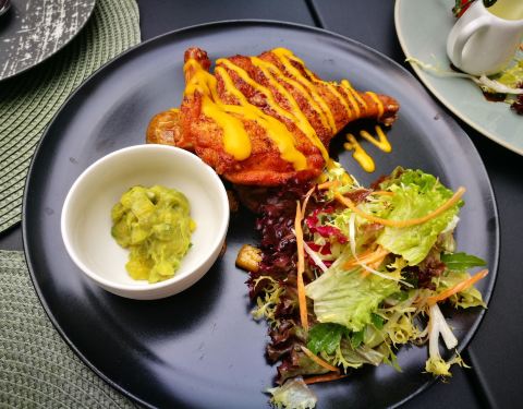 驱车来买拿破仑,路边的时候就被这家店整面的落地窗和里面干净简约的装修吸引了,刚好吃个午饭。 [环境]位于lv隔壁,推拉门不起眼,倒是一堵简约的墙吸引人。里面空间大,座位不少确也不拥挤,靠窗位置可以近览外面湖光水色,真是惬意。 [服务]服务员热情,绅士有礼,细节都做的到位。 「墨西哥式焗蛋」看旁边点了两份,好奇心让我也打算试试。上菜时候觉得有点失望,又是卷饼,早上才吃的。不过吃下去觉得还是不错,这个饼是脆脆的,加上酱料,咸香酥脆又有酸甜的融合。 「康沃尔式鸡」很大一份,烤鸡金黄不腻,有机土豆烤出来也绵密香,酱料酸甜有点回味。
