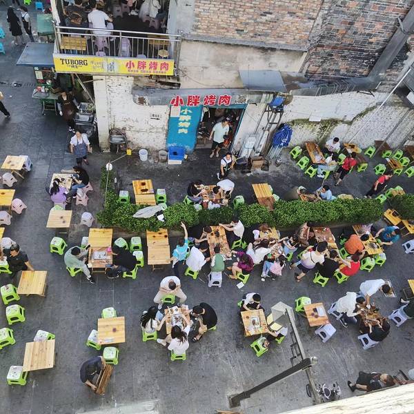 在文昌阁周围转悠的时候,突然,被我发现了新大陆。 在文昌阁城墙和省府路小学的中间,有个空地,还有 几条窄窄的夹弄和巷子,都放满了小桌子、小凳子,这是什么情况?此时,大概是17:00左右吧,很多座位都坐满了人,还有人在等位,有的人已经开始拼命撸串烤肉了,难道贵阳人民的夜生活这么早就开始了?! 以前,一直认为慢生活首数成都人民,眼下看到贵阳人民的这幅画面,我真的是大吃一惊了,太阳还高高地悬在天边,就开始夜生活了,这生活也太惬意了吧!看到这幅画面,一下子让我莫名其妙地兴奋起来,冲动地想加入这支队伍。 经过打听,知道这条街叫电台街,是贵阳很有名气的小吃一条街,这家“小胖烤肉”,占据了路口第一家的地理位置,二十多年的磨砺终于熬成了网红。看到这道风景线,让我大庭广众之下,哈喇子淌了一地,太难为情了。