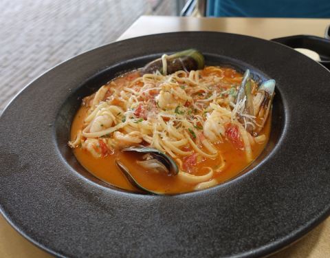 正对着孤独图书馆,海鲜汤,海鲜饭无比正宗,赠送的面包调料就有两种,诚意十足,第二天的早餐差不多都带出来了,加柠檬水也很及时,二层有少量桌椅可以吹吹海风,挺完美的。