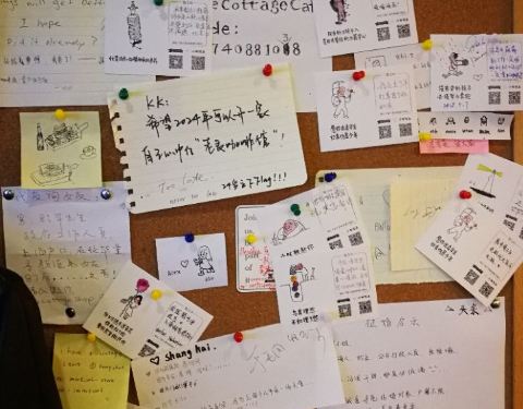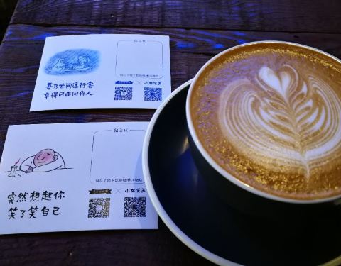 这家咖啡馆位于武康大楼底层,有淮海西路和武康路两个门,原来武康路这个位置是家喝咖啡做指甲的小店,半年多前经过发现换这家了。据说是从别的地方搬来的,外形看挺文艺,走过好几次,终于忍不住进去喝一杯特色老麦咖啡,吃一片巧克力蛋糕。里面空间不小,英法混合风格,点单付费在靠近武康路的房间,相比之下靠近淮海西路的另外一个房间就比较幽静。放着不少小林的人生漫画明信片,喝咖啡时相对苦笑一下,放松放松