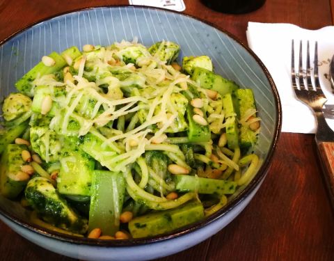 又去了一次,赶在上海夏季高温出现前的最后一个蓝天白云日子。这次去发现竟然还有二楼,洗手间也在二楼。来来往往进出的人不少,绝大部分点单后就坐到了二楼或靠近淮海西路的那间。毕竟靠武康路这间稍显拥挤,两个服务生小姑娘一直盯着你,不太好意思露出不够优雅的吃相。点了个青酱鸡肉意大利面,天热了,口感清爽,冰拿铁做的非常出色。看到还有一百多元一个的牛肉汉堡,不知滋味如何,这个价格有点小贵呀