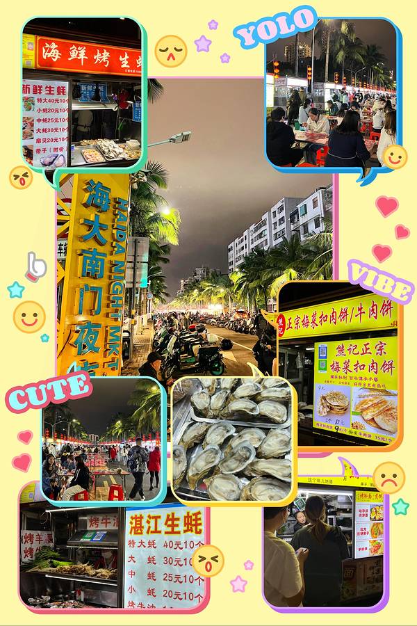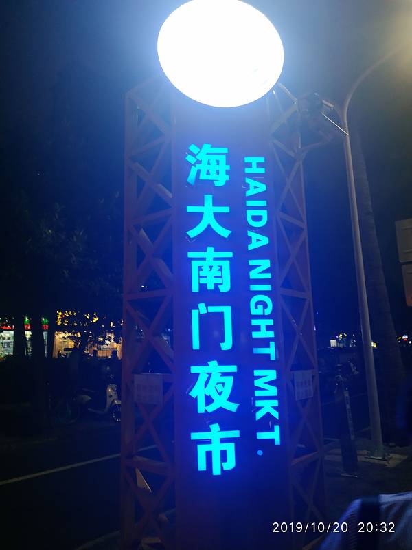 《无夜市,不青春》 要问本地人:海口最具烟火气息的地方在哪?相信大多数人第一时间都会说“海大南门夜市”!所以除了骑楼老街,属于海口的烟火味一定少不了海大南门夜市。 这条夜市之所以叫做“海大南门大学”,是因为附近有所大学名为海南大学,小吃一条街就在海南大学(海甸校区)的南门外。 既然这么出名,那在海口旅行,那必定要去看看的。夜幕降临,海大南门夜市灯光璀璨,俨然已成为这个城市的一道靓丽风景线。 漫步在海大南门夜市中,放眼望去,每个摊位上都是统一打造的餐车,车顶悬挂着一串红彤彤的灯笼,十分喜庆;人群络绎不绝,却井然有序,来此寻觅小吃美食的,不仅有本地市民,还有大学生,甚至来打卡的游客。 先逛一圈,海大南门夜市可以一边吃小吃一边逛街。琳琅满目的小商品、丰富的海南水果都可以满足你的消费欲。 从海南当地特色清补凉,正宗糖水,鲜榨椰子,鲜榨芭乐,陵水酸粉,糟粕醋,油炸串,到台湾蚵仔煎,长沙臭豆腐,温州瘦肉丸,扬州炒饭,淮南牛肉汤,西安肉夹馍,重庆麻辣烫,成都钵钵鸡……凡是你所能想到的全国各地小吃,这里应有尽有。另一个原因是除了种类繁多,而且物价便宜。 在经历了一天的海口旅行后,夜晚就来海大南门夜市逛一逛坐一坐,品尝几样美轮美奂的小吃美食,感受来自灵魂深处的抚慰。 没有去过海大南门夜市,都不好意思说你去海口旅行过,或者说你的海口之旅就不算完整。无夜市,不青春!海口最具烟火气的地方,你来打卡了吗?! 小贴士: 海大南门夜市 地址:海南省海口市美兰区海甸岛三西路14号; 营业时间:18:00---次日02:00; 人均:20元 推荐指数:★★★★★ 游玩攻略:海大南门夜市在海南大学(海甸校区)南门外,这里不仅离海南大学(海甸校区)很近,距离云洞图书馆&晓岛,海口世纪大桥,万绿园,骑楼老街,白沙门公园,白沙门沙滩等打卡景点不算很远,海大南门夜市可以作为打卡最后一站结合游玩。 美食攻略: 海大南门夜市不仅有小吃区,还有小商品区、衣物饰品区、水果区。推荐的美食有海南第一家清补凉,黄记正宗糖水,蚵仔煎大王,黑色经典臭豆腐,麦香村香酥鸡柳,邵师傅梅菜扣肉饼,最牛牛杂,温州瘦肉丸,姐妹油炸串,秘制铁板鸭肠铁板鱿鱼,章鱼小丸子,台湾无骨鸡柳,糟柏醋,张家肉夹馍,陵水酸粉,钵钵鸡素材,香煎豆腐,扬州炒饭,麻辣螺肉,鸡蛋仔,中国好地瓜,水果炒冰,碳烤生蚝等。
