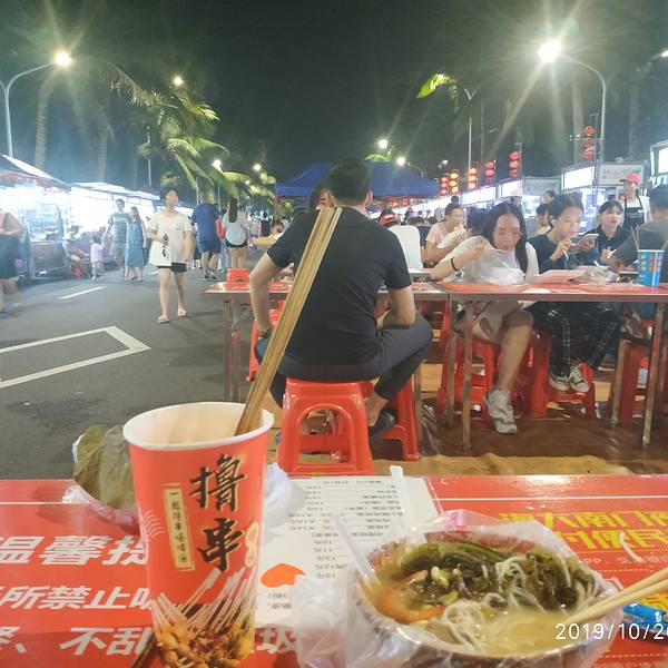 这封了一条大马路来作夜市,主要服务于海大学子,晚饭时间这看起来就像是海南大学的露天食堂