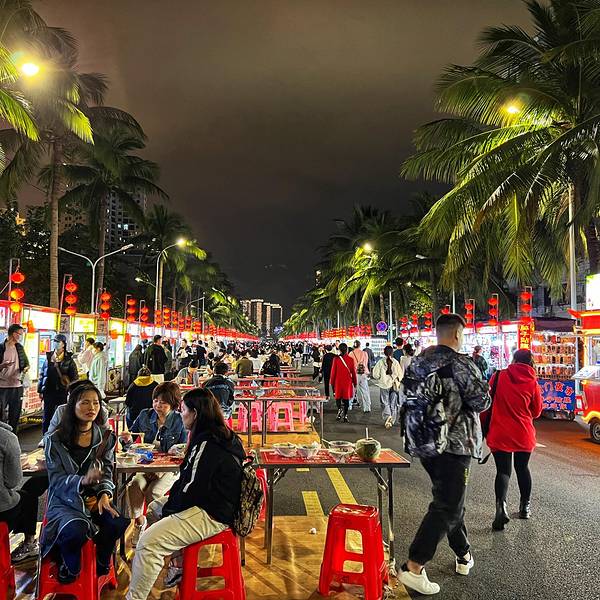 海南大学南门前的这条街是各类小吃的天下,在海口非常有名,虽然环境嘈杂,但很有大排档的感觉。在这里,清补凉、肠粉、炒冰甚至卖鸡蛋饼的摊档应有尽有,尤其在晚上各个摊档前人头攒动,非常热闹。更重要的是这里的价格非常亲民,不仅吸引着游客慕名而来,也有许多的当地人前来享受美食。