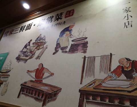 但是墙壁上面很好的展示了这边的三鲜面的一些制作手法,还有一些文化图案,老板在这边也是比较勤快的...