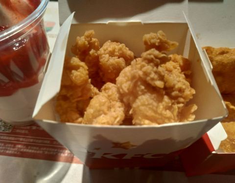 去武汉网球中心观看现场比赛,中午在对面奥特莱斯的肯德基享受美食。这次点了一份鸡米花,一份上校鸡块,一杯冰淇淋。价格真心不贵,都是优惠价购买的。