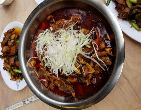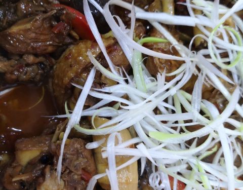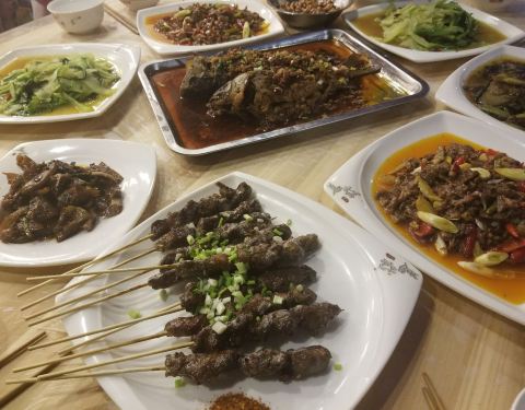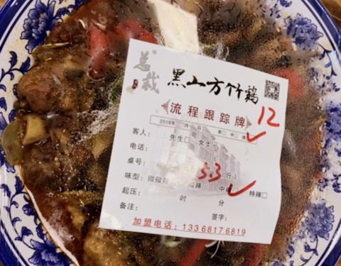 翻越千山万水只为找到你,黑山方竹鸡!硕大的招牌下面有一副微胖美女图,这搭配很是特别! 千闻不如见面,真的里里外外、卡卡角角、周周围围都是人,有一大哥仿佛独自在享用盛宴,很有喜感!这非常复合网红打卡点的气势! 鸡,要的中辣!说实话中辣没有想象中这么辣,老板黑耿直被问及是否是土鸡时,老板明确回答说卖土鸡的都是豁人的,都是用的贵州跑山鸡。鸡入味,汁很多,笋子特别Q! 5个人326,吃得舒舒服服,这价格在景区来说还是很实在了,下次上山避暑还会来。