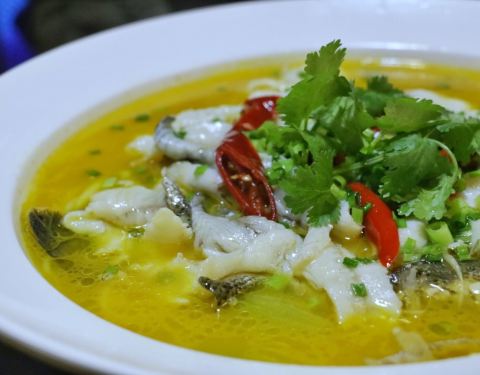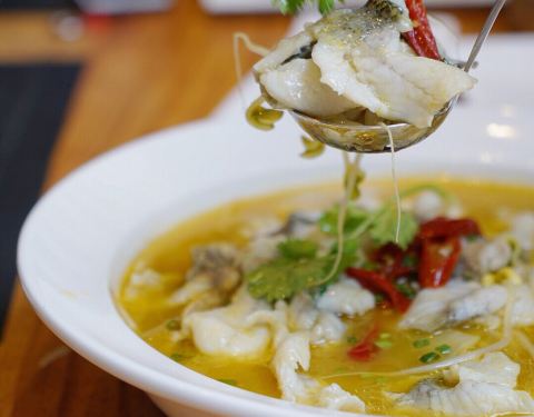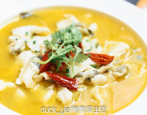 酸汤鲈鱼,酸辣劲爽的米饭杀手,鲈鱼肉十分娇嫩,带皮有胶质的部位口感一级棒,下面的配菜也很入味好吃