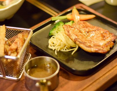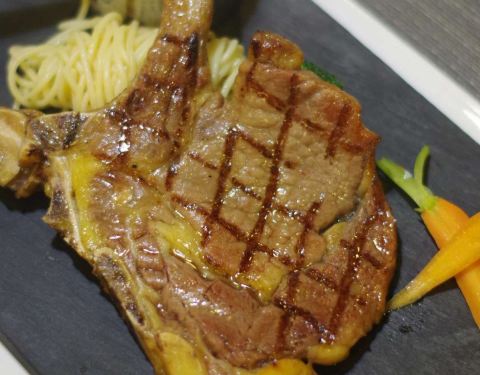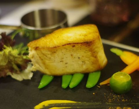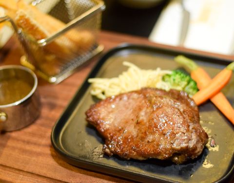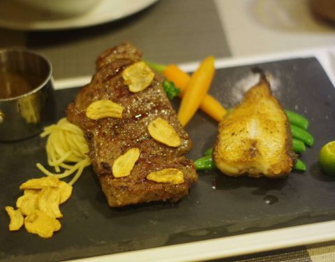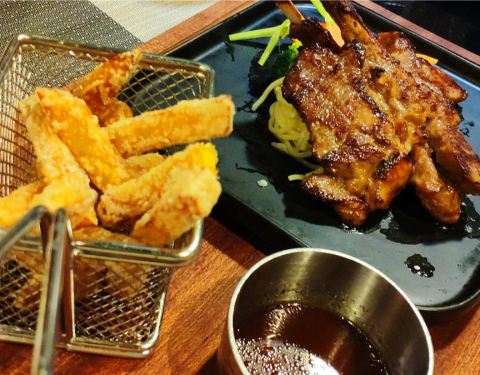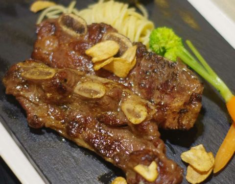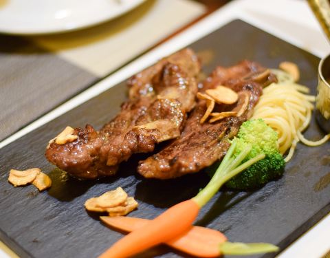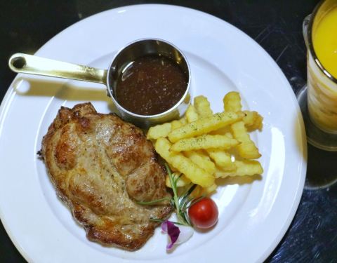 膨胀了膨胀了,月光也敢出来吃牛排啦!之前在朋友圈看到摇滚水果的推荐,打算试试,结果我们在周围绕了一圈硬是没看到,后面看到摇滚友,一问才知道店升级,名字也升级了,哈哈哈哈哈~ 环境蛮有质感的,一进门就能看到自助的吧台,除了提供水果,还有玉米、麦黍之类的粗粮,饮料是五谷类的,还有咖啡机供应,狂喝了两杯,那天晚上就闭不上眼了。 这次是冲着牛排来的,虽然每一口牛排都是钱的味道,但真香、真好吃。 虽然厚度没有美式辣么跨装,但肉质软嫩,汁水也蛮丰富的。和基友点的沙朗牛排和法式香草羊排吧,表现最佳。 沙朗牛排带嫩筋和油花,口感有嚼劲,瘦肉部分蛮嫩,浇上他们特制的黑胡椒酱吼吼吃,剩下酱汁拌意面刚刚好。 法式香草羊排,香草味不浓烈,但羊骚味也不浓烈哒!羊油部分烤的有点脆,吃上去很香呢。除了酱汁,建议再撒点海盐,吃起来更香。 香煎金枪鱼很大块,比起配酱汁吃,我和基友一致想蘸着酱油吃,哈哈哈哈~ 芝士焗斑节虾也棒棒,饱满的虾肉,体型有手掌辣么长,而且芝士超级多,刚上还能拉丝嘞,芝士控开心的转圈圈~ 其他小食偏炸物较多,搭配沙拉吃也蛮不错的,就是意面比较一般。