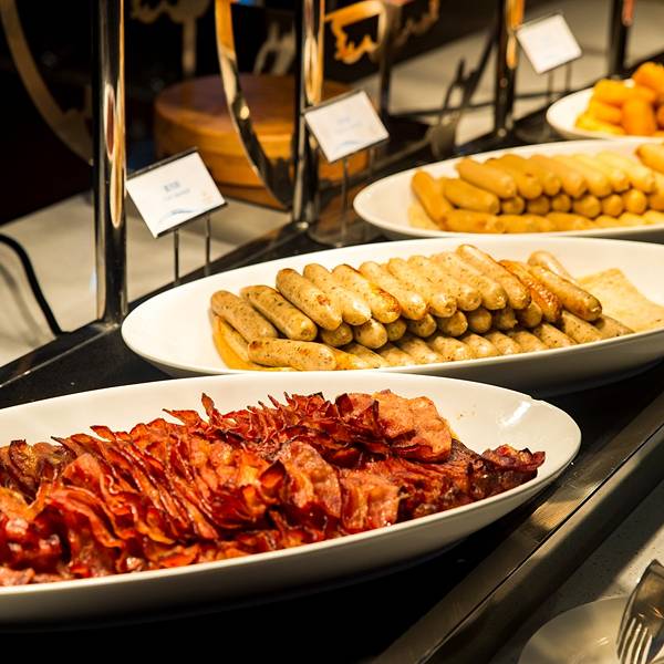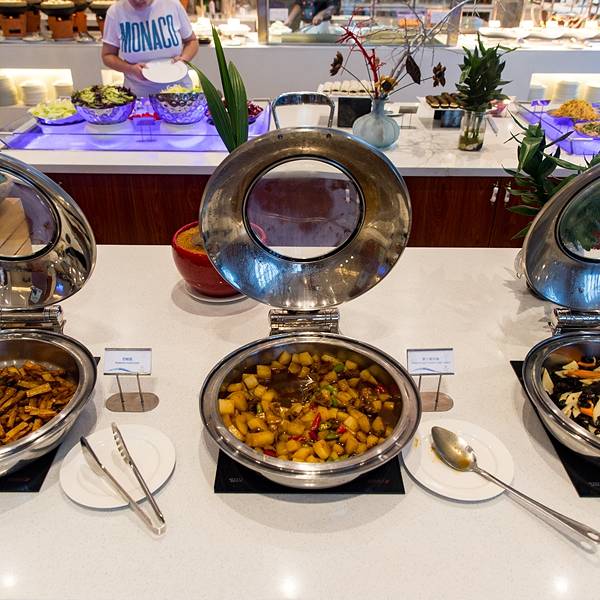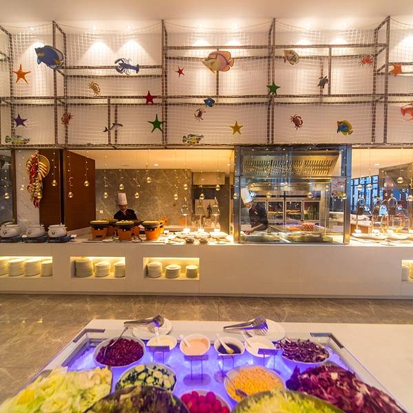 自助餐厅早晨6:30-10:00提供早餐,晚上6:00-9:00提供海鲜自助。 通过两餐对比,拍着胸脯告诉大家早餐更加好吃! 单单面包的种类就不下十种,有烤面包片,羊角包,欧包,软包,还有炸面包!各式各样。搭配水果沙拉区域、粤菜区域、河粉米粉面档,内容丰富,新鲜美味。 海鲜晚餐内容略单调,海鲜就红毛蟹,海螺,海蟹,大虾,蟹脚,其他就是四类日本生鱼刺身,炸鱼等,叫做海鲜自助真牵强。唯一可以推荐的是瓶装啤酒畅饮,烤羊肉串。