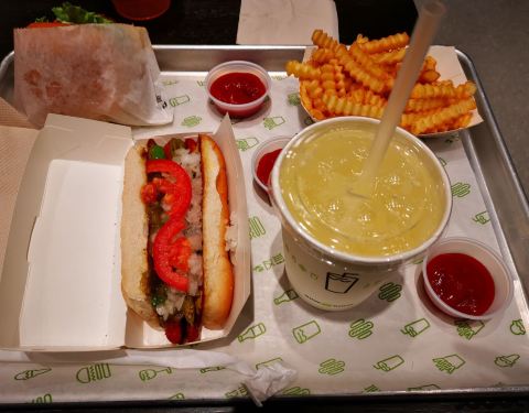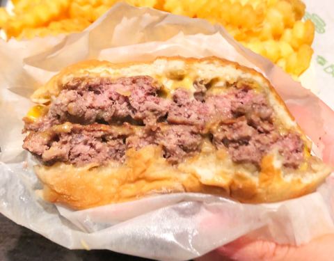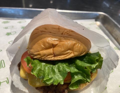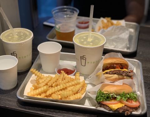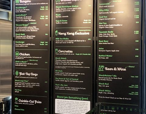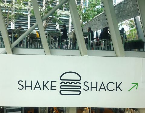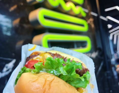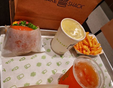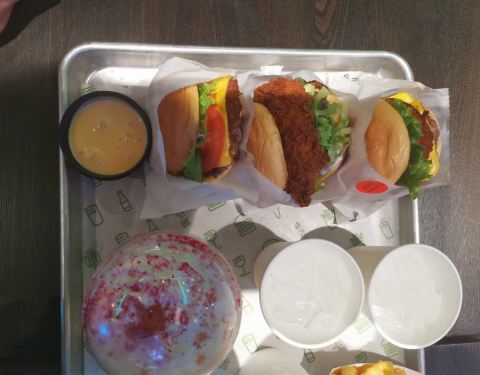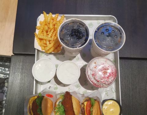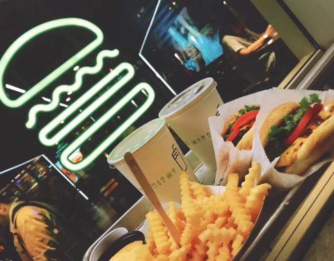 shake shack 这家牛肉汉堡店一直从纽约火到香港,香港在中环有这家店,排队排了五分钟左右,人不算多,点了招牌汉堡,和薯条,味道很不错。