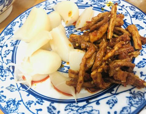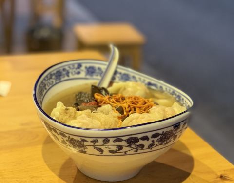 对翟大爷一直心心念念,昨天和JM干脆择日不如撞日,就寻了过来。感谢我JM,不辞辛劳带我飞! 来的时候已经快到晚上七点,虽然没有排队,但还是那种要拼桌的架势,可想而知店里的人气该有多么旺!太喜欢点单的嬢嬢了,态度飞好,一直笑嘻嘻的,完全不嫌弃我的瓜问题,耐心地解释。点完单还不忘说一句,先吃到开胃菜等到哦。完全不是有些网红店那种“只留鼻孔在人间”的臭德行。而且翟大爷的中差评下也没有出现任何一句狡辩抵赖、冷嘲热讽,手动再点赞! 招牌和餐单都是毛笔字手写的,很有文化范儿。而且店里的餐具也都是青花瓷图案的,干净整洁之余,也增加了一分质感和品味。 开胃菜是【香辣萝卜干】和【糖蒜】。萝卜干的嚼劲还是蛮足的,但是咸味不太够。糖蒜是加分项,清脆爽口。 我很喜欢【鲜虾蟹子抄手】,每个抄手中都有一个完整的虾仁,口感Q弹饱满。但是我觉得我选错了口味,如果是鲜虾抄手换做鸡汤底的话,应该更鲜美。这里的竹荪鸡肉底汤完全能够担当“货真价实”这个词!汤味浓郁,不是那种鸡精味精勾兑的味道,还有鸡瘦肉丝在其中。 干拌的口味让我稍微有些失望,因为干辣椒面有些不太入味,如果能够加一道工序,淋一点明油的话,辣椒面的香味应该能够被逼出来,我觉得味道会更香,油气也会更浓郁一些。猪肉抄手的馅儿没有鲜虾蟹子抄手那么饱满,要是肉馅再搅拌上劲一些,应该会更好吃。 整体来说,确实不便宜,但是抄手的个头大,味道也不错,确实贵有贵的道理。