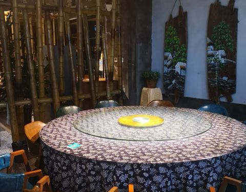 朋友聚会,肯定就是吃一顿三 喊我负责安排,在金牛万达附近,点开大众点评,发现人民北路排名第一就是它,以前没有吃过,看图片环境也可以,也有大桌子就确定的这家。 点评网定位很准确,进门先是个小院子,竹椅竹桌,再加上边边上的一排竹子植物,瞬间就从大城市街道转换成田园风情,这点我还多喜欢的。 一楼二楼适合人数少的,我们人多直接安排到三楼,三楼有两个大桌子,类似包间的感觉,但是又不是纯粹的包间,房间用竹排隔开,桌布用的扎染布,有点那年去宜宾的感觉。 最先端上来的是火锅,吃饭那天正好降温,所有人的目光全部聚焦在这口锅上,小小的等了一下,服务员打开锅盖,所有人全都站起来吃了,圆桌聚餐变成站着吃火锅,哈哈哈,而且大家都不客气,站起来就没有想坐回去,可见这个火锅好逗人爱,里面有丸子肉,主题,酥肉,还有芋头萝卜,芋头太好吃了,是那种小芋头,入味又软糯。 还点了鲫鱼和火爆肥肠,都好吃,其他菜端上来就被大家吃了,完全没有时间拍照,大家整体都非常满意呢。 他们家酒我推荐各种水果酒,店家用小葫芦瓶装的,七种口味放在一起可以唱葫芦娃了。。。