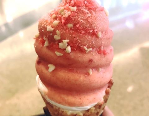 如果综合评价的话,应该是3.5星……条状的泡芙,上面有花生碎,是挺好吃的,但是,价格17,感觉不值得呀,问题是,还偶尔烤焦,已经来过多次,第一次评价。路过看到过很多次排长队买冰淇淋的,人们总是喜欢排队,其实排队的时间宝贵多了!冰淇淋当然是很不错的,浓郁,草莓味原来是限定的,的确很好吃,就是这款粉色草莓,值得一试~不过,貌似没有啦~还有,配图是我的,不是盗窃……