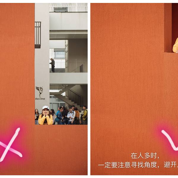 比如 下面这两张,换一个角度,画面瞬间与众不同。特别注意:人多时最好避免广角镜头,可以使用焦段较长的镜头或是手机上的人像模式。那么通过这种寻找角度与色块的方法,就可以在这里拍到承包N面墙的“照骗”啦!最后请注意,穿衣搭配也非常重要哟,衣服千万别太花,色彩越简单越出彩!
