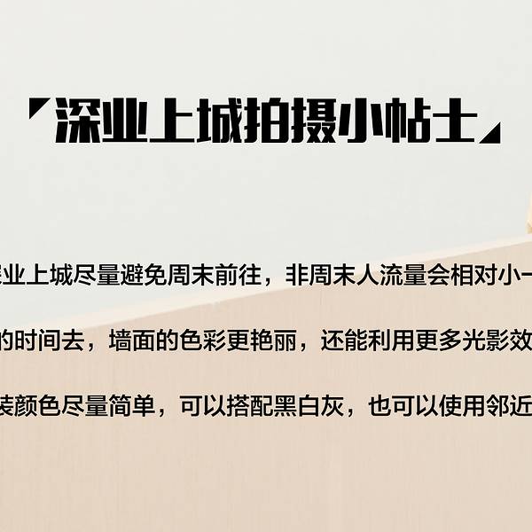 周末深圳城里车并不多, 深圳 人很会享受生活,假期一般会去周边海滩休闲度假。我们时间短,舍远求近,选择了 深圳 最近超火的“色彩小镇”深业上城打卡。 不出意外全是人人人,震惊之余,我很好奇这个看起来很普通的商业街区,究竟怎么C位出道的!?自从中国第一部硬核科幻《流浪地球》席卷今年贺岁档,电子书上又多了几本刘慈欣的小说。而国内最让我拥有科幻感的地方,目前当属各种黑科技于一身的 深圳 CEEC—— 中国国际消费电子展示交易中心,地址就在深业上城。什么裸眼3D效果的中国第一台声光电ET电梯,可以秒变飞行员的华南第一家飞行体验舱恒膺飞行俱乐部,还有3D打印技术、VR体验中心、大疆体验中心等等,连中国中科院最新的应用成果都在CEEC展出。当然这里各大品牌入驻的超大型购物商圈也带动了人气,但这些我认为都不是深业上城最火爆的地方。此刻在我视线可及之处,密密麻麻端着相机、手机,闪光灯一阵狂拍的人群才是重点。周末天气不佳云太厚,我们并没有感受到网上所说蓝天映衬下色彩的惊艳感,但眼前这些大色块的墙面,很像国外那些网红墙,可以说非常适合街拍凹造型了。 但人太多了,平均每面墙下面都有3-4组人在拍照,超恐怖! 不过!作为职业摄影师,所有的问题都不是问题,一蕊和小强教大家如何在人山人海的商业体里拍出漂亮的ins风照片。首先需要注意观察寻找色块,第二层露台可以找到很多彩色房子的几何构图,这里主要运用了橙、红、黄、灰色四种颜色拼接而成,我们发现很多2-4种的色彩交汇的角落,通过简化构图就可以得到简单纯净的照片其次在人多的地方拍摄,切记要化繁为简,以人物为中心,利用减法原则,避免其他干扰元素入镜。 比如 下面这两张,换一个角度,画面瞬间与众不同。特别注意:人多时最好避免广角镜头,可以使用焦段较长的镜头或是手机上的人像模式。那么通过这种寻找角度与色块的方法,就可以在这里拍到承包N面墙的“照骗”啦!最后请注意,穿衣搭配也非常重要哟,衣服千万别太花,色彩越简单越出彩!