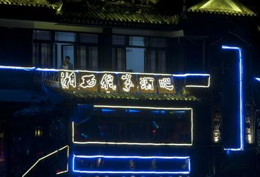 酒吧就在沱江边上,靠近北门码头附近,上面是凤凰城精品酒店,酒吧到了晚上非常热闹,有歌手唱歌,来泡吧喝酒的客人很多,很有民族特色