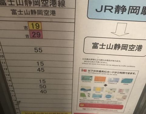 静冈机场很小,但也有直达上海的航班,从静安JR站坐班车到机场大约40分钟左右,图片有时间表可以给大家用,巴士可以使用西瓜卡。