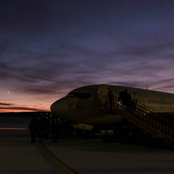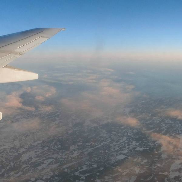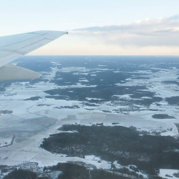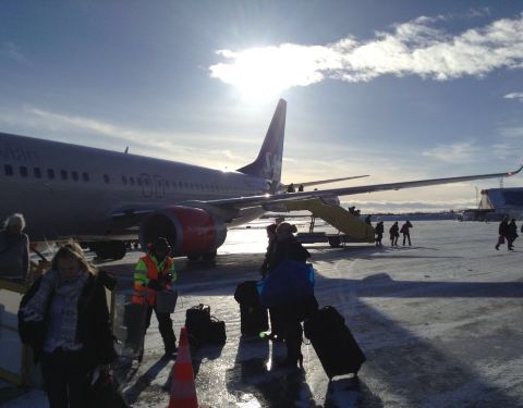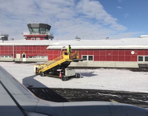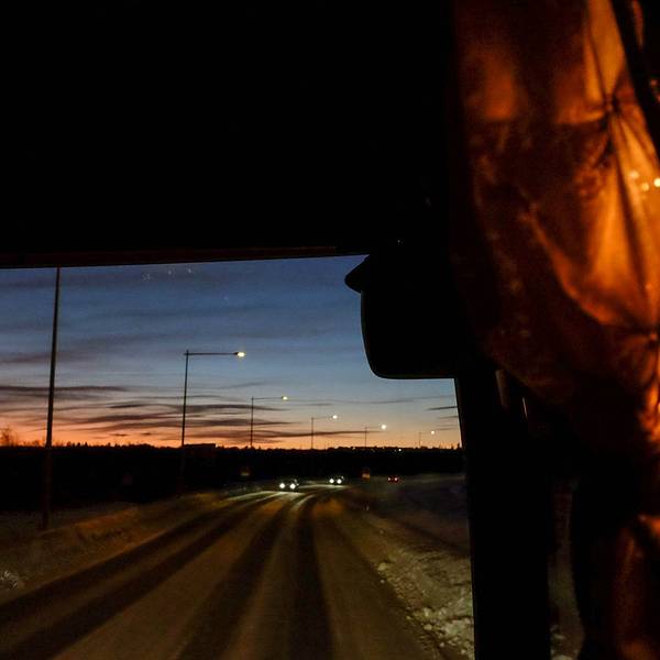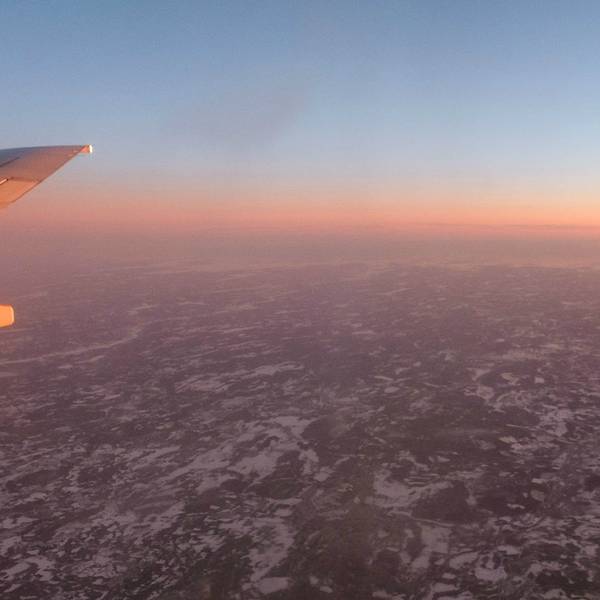中午时分,我们再次乘坐机场快线来到了阿兰达机场。我们的航班是从T4出发,这个航站楼很小,出发和到达都在一起,大厅里一共就只有几个工作人员,所有的登机手续(包括托运行李)都是自助的,打印登机牌的时候需要订票时的reference number,找不到的话( 比如 我们)就只能找工作人员帮忙打出来了...... 不过后来就一切都很顺利,飞机也是准时起飞~从起飞的那一刻起,我就像坐在车上的狗一样一直盯着窗外一眼都离不开……虽然是短短一个多小时的航班,但是窗外从一片雪白,到飞上云层看到蔚蓝的天空,到机翼被晚霞染红,再到天色渐渐变暗,我们就在天空中度过了北极圈冬天极为短暂的白天时光。飞机降落后,在缓缓滑行的时候突然转了个弯,转过弯后这个明亮又清澈的月牙就突然呈现在了我的眼前。在淡紫色的天空中突然看到它,感觉心都要化了~下飞机后,很多人都没有着急离开,都在记录这美丽的一刻。而这也是 基律纳 给我的第一印象,是一个美好的开始,也暗示着旅行中接连不断的幸运~取了行李,我们搭乘门口的机场大巴,前往市里。给司机看酒店地址的时候,旁边一对老夫妻说他们也住在那里,所以下了车我们直接跟着他们就找到了酒店哈哈。