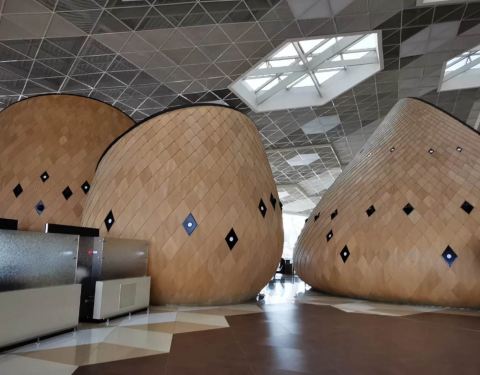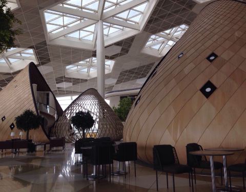 阿塞拜疆的机场,装修很漂亮,餐饮区采用的是竹编的“栗子”形状的建筑。每个“栗子”里面都是一个咖啡厅或是简餐厅。 休息区座椅充足,铺有浅棕色地毯,卫生保持的不错。 设有吸烟室,方便烟民。 免税的规模不大...