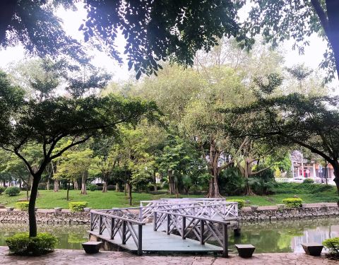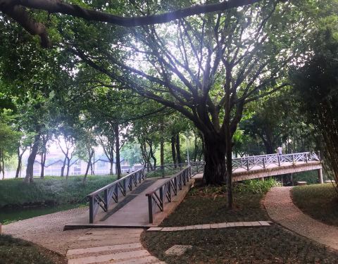 北滘公园有湖有桥有绿道,休闲一类的风格。在北滘新城北滘门对面的市政公园