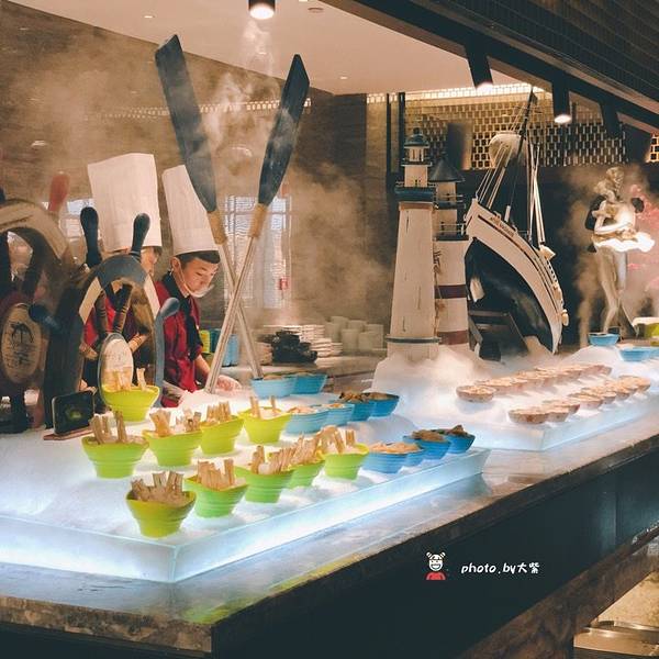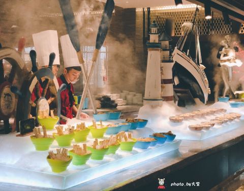 南京排名第一的自助,海鲜为主,大部分比较新鲜而且难得一遇(鲜海胆 各式贝类等),梭子蟹大闸蟹也充足供应,还有鹅肝牛排等,每人可取半只小青龙,当然还有不限量的哈根达斯和活鲍鱼(在不停扭动,放到锅里活活煮死比较残忍,吃了两个就放弃了)。这些不消多说,就不赘述了。说几点改进意见: 1. 火锅纯炭火的,无法调节火力,锅又小又浅,实在涮不了多少东西。感觉改成电火锅对这种店无论技术还是成本都不是问题。 2. 桌子太小,盘子不小(一个瓷盘,装两只虾剩下还有很大空间,结果盘子本身太大,两人桌放不了几盘就满了),实际桌上可以摆放的内容有限。另外盘子可以多用塑料的,轻又摔不碎。 3. 吃完海鲜多少要消食的,这里没有花蛤蛏子(可能与定位相比显得low了)也就罢了,连南瓜粥,桂花酒酿,银耳羹也不搞一点,实在说不过去。 4. 个别海鲜例如烤生蚝,明显感觉的出不是很新鲜,因此拉低了整体的逼格,不值得。 对了,开车去的可以把车号报给前台,免停车费。