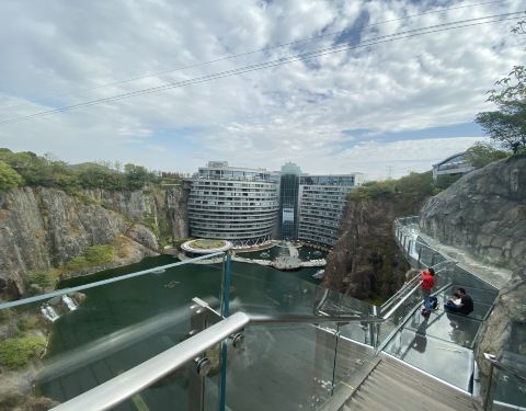 玻璃栈道就在深坑酒店对面,是最佳风景点,栈道会限流,需要排队,每个人都要花10元买鞋套,先买券再排队,前后排队20-30分钟吧。把券给工作人员拿鞋套,下楼梯后有椅子坐着穿。