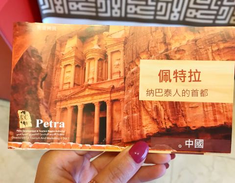 Petra 的大门——游客中心的大门——我么有拍到。一边走一边拿着手机拍,晃动的照片有点糊了,看不清楚,所以删掉。之后似乎也没再找到机会拍~>_<~ 大门进去后,到达一个圆形的小广场,迎面看到的是各种纪念品小商店,往左一点标着大大的 Visit Center。Visit Center 再往左就是博物馆入口了。这个博物馆很小,基本由墙壁上的介绍版和玻璃罩着的展览品组成,无他物。但是,作为在进入前又个大致了解的基本科普还是很不错的选择。 看到有纸质介绍手册,想过去拿。找了半天,发现竟然没有中文的,我们要投诉了!转了一圈,发现中文版的放在另一个比较不起眼的角落^_^||| 整个博物馆粗略的全部浏览一遍,不需要太久。像我这样的门外汉,看个故事,看个造型,差不多 45 分钟。