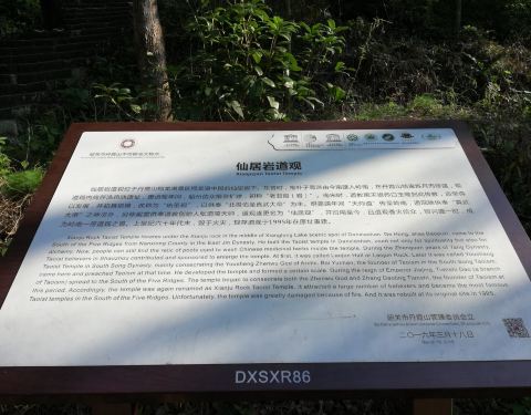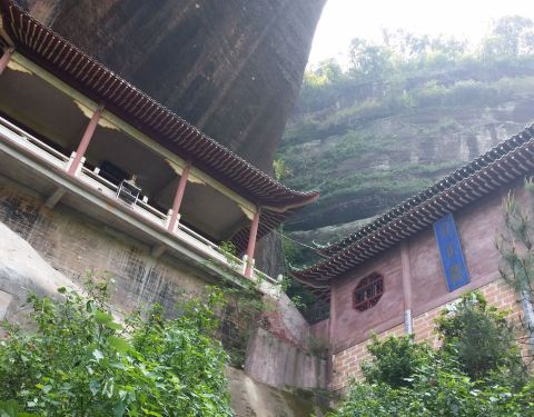 仙居岩道观:位于广东省韶关市仁化县丹霞山风景名胜区内,距翔龙湖不远。道观依绝壁悬崖岩石而建,巨岩道观,别具特色,犹如仙境。相传这里曾是张天师南游时居住的地方,后人为纪念张天师而建此道观。