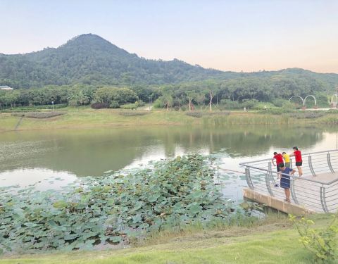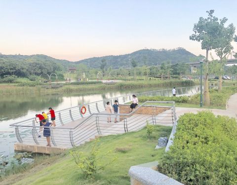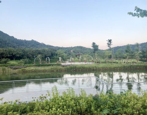 荔枝红果满枝;10-11月,枫树红叶飘飞。 天然形成的水库风光 沿着新修建的盘山道 放眼望去处处皆是郁郁葱葱的山林 路边的鲜花在春风中摇曳 大小的水塘如明珠般点缀在群山间 这就是宝安人的“新朋友”