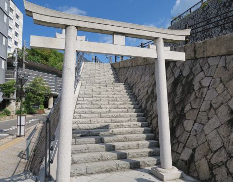 在做攻略的时候知道拍道后温泉本馆全景的地方是在空中步道,本以为这是一条像高架桥那样的空中步道,来了一看才知道这其实是一个高高的垒台,上面是停车场。行人从道后温泉本馆的后面有一个鸟居长长的台阶走上去就行了。不过我们来的时候,温泉本馆正在维修,整个本馆被围起来了大部分,很遗憾没有拍到美美的照片。