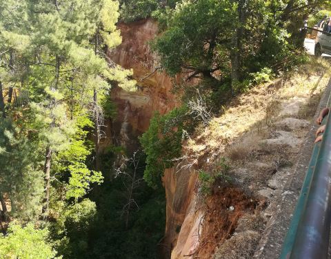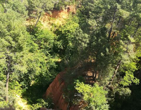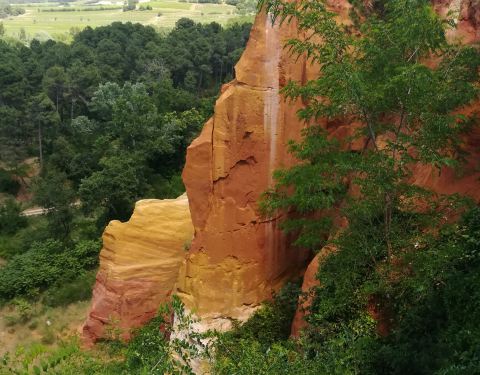 传说中红土城Roussillon的领主年轻美丽的妻子爱上了游吟诗人, 心胸狭窄的领主为了报复, 残忍地将诗人杀害, 深爱诗人的妻子不愿在失去爱人后独自偷生, 纵身跳下悬崖, 殉情而死, 鲜血渗入到土地里. 从此, 这片土地就一直呈现出深深的红色