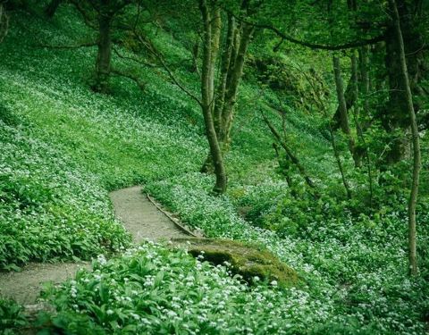 Malham Cove 12 英里徒步(英国约克郡) 第一段: Malham 到 Janet''s Foss. 从停车场出发,过小石桥后经过一段田园小道,就到了Janet''s Foss, 这里有遍地的野韮菜,飘来阵阵清香,瀑布和小河的流水加上轻风吹动的...