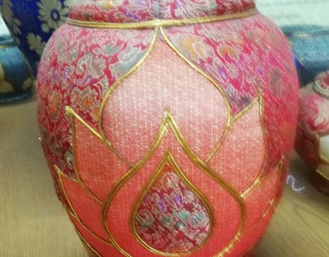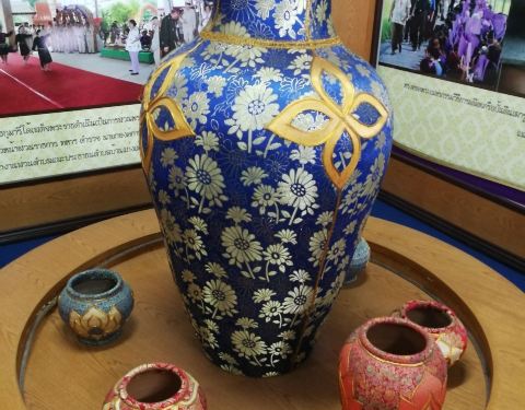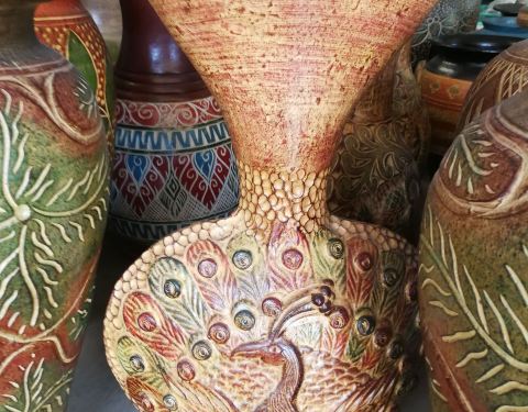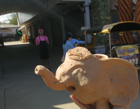 和一个姐妹从“彭世洛府”坐火车去“北榄坡府(即那空沙旺)”。车却是到了“春盛”,无奈又在火车站对面坐“yellow bus”去目地的,路上近一个小时。 到了汽车站,有返回的汽车,买了下午的末班车五年的,车程2个小时,到新汽车站在12号公路上。 定了三个点,因时间关系没去“市场”。先在汽车站包了小嘟嘟车300去“班孟陶瓷博物馆”,这里周六、日不开放。其实就是一个三四间相连的屋子。不过里面有一组精美的陶罐,外披像泰丝一样的布,制作比较精美,不知道卖不卖呢。里面还有公主到访的照片。外面甚至近处路边,都可见卖陶器的,大件的多些。图1--9。 然后直接回到“天堂公园”(那空沙旺公园),里面的湖水宽广,岸边绿树成荫。没见到租自行车的,那个小岛上的人造瀑布有三十多米高吧,也没有水。时间不多了,匆匆就出来了,没有到最里面。